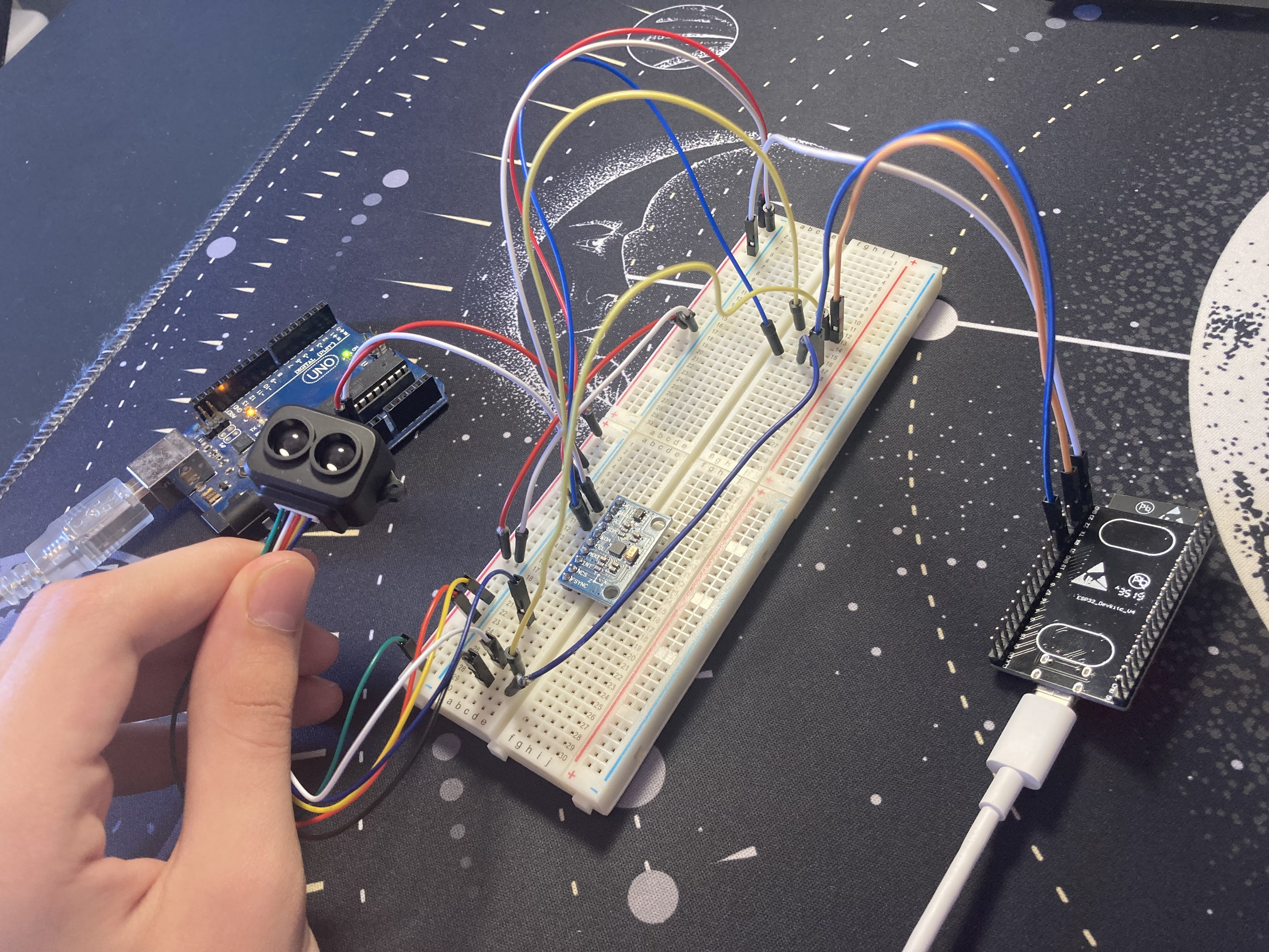 I wired the IMU up but when writing the code I realized I didn't even know what an I2C address was so I decided to do some research on how that works. And I learned that you can connect multiple devices to the same bus with only two wires. I just for some reason assumed each device needed two wires each. I decided to wire the LiDAR as well to the same bus, and after installing the necessary libraries and making the code, I got both the LiDAR and the IMU to work at the same time.