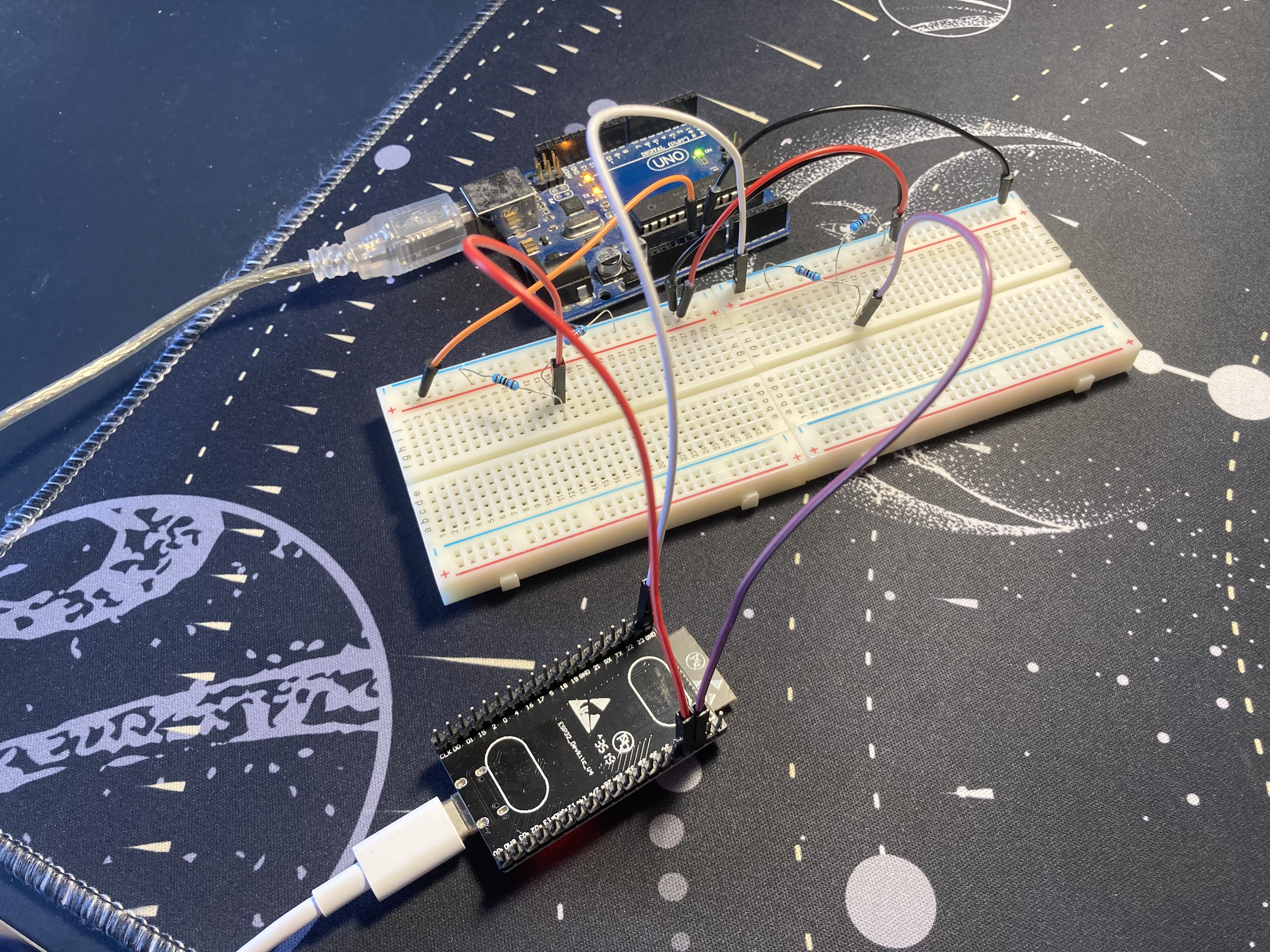 I started by testing the LiDAR with the ESP32. In the real thing, the LiDAR is powered by the BEC output of one of the ESCs. As the ESP32 is a 3V3 device, I had to use an Arduino UNO to provide the power. I made the following circuit: