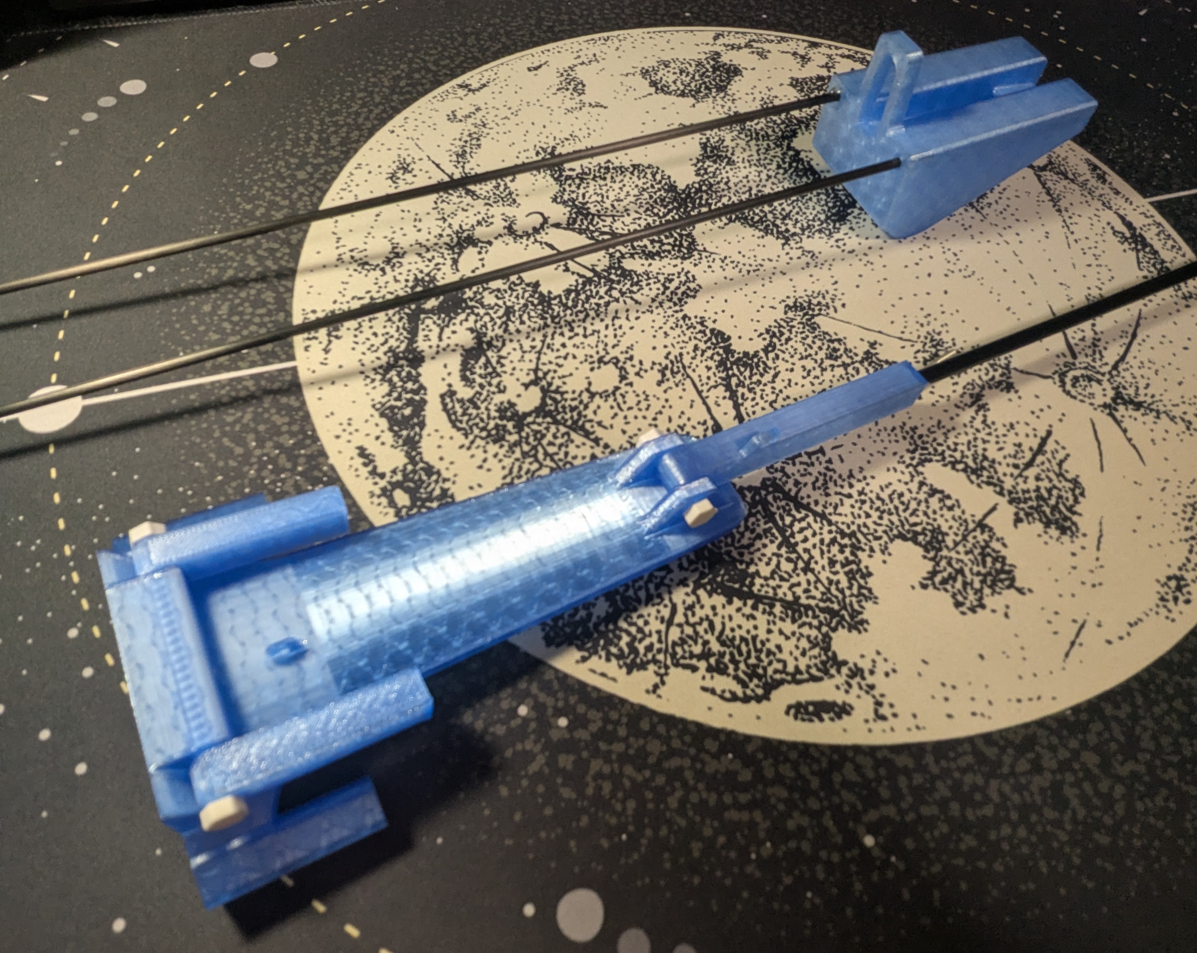 I updated the design and printed it once again, except because only the fact that the hole was longer on the new design increased the friction enough to make fitting the rods impossible. At this point I had spent 90g of filament already so I really needed for my next attempt to go right. I dried the filament and printed more test pieces, and I think I dialed in the tolerance for this length, but I'll have to dry the filament more to get rid of all the bubbles which I think are currently preventing the rod from getting all the way through.