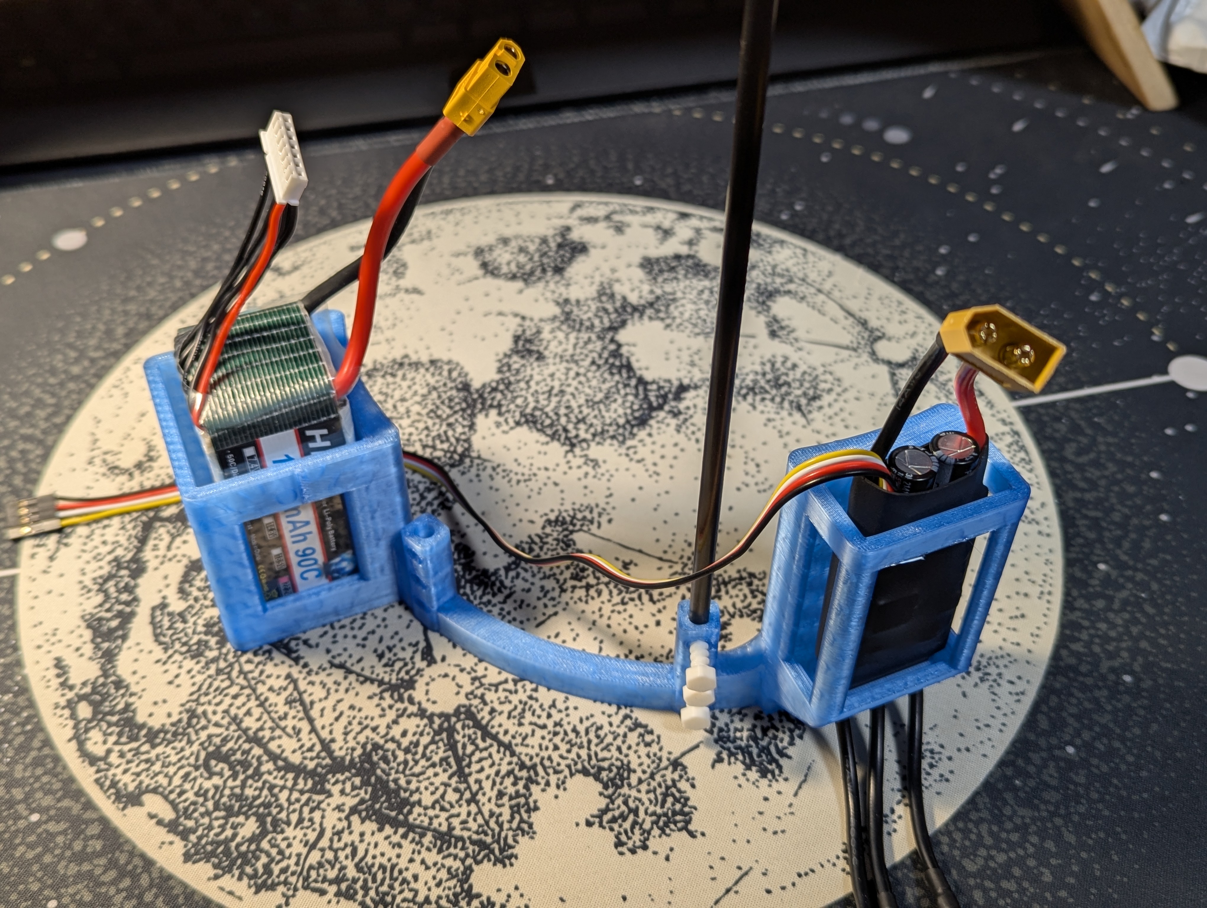 Finally I started working on making the full circuit, for which I planned to use the actual BEC outputs of the ESCs. However I forgot that without the motors connected (which I have to solder the connectors for) the ESCs can't make sounds and I can't calibrate them or configure them at different voltages. In the end I chose to not test the full circuit, as I've verified that every subsystem works and I prefer to solder the motor cables and connectors later on when the vehicle is assembled, so that I can choose the most optimal cable length.