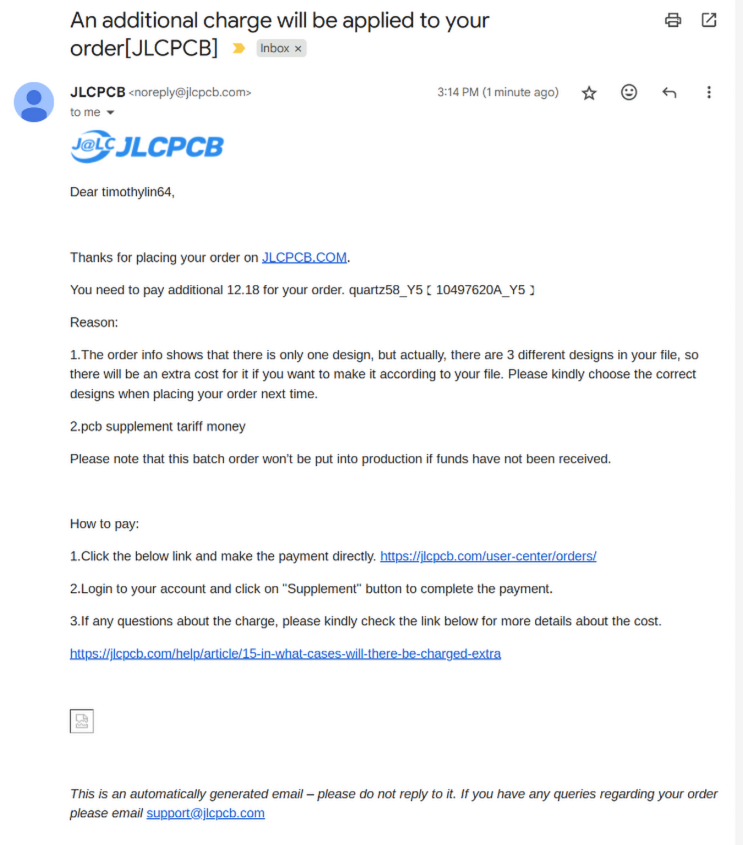 - When ordering the PCB I didn't select the 3 designs part, so I had to pay the difference out of pocket