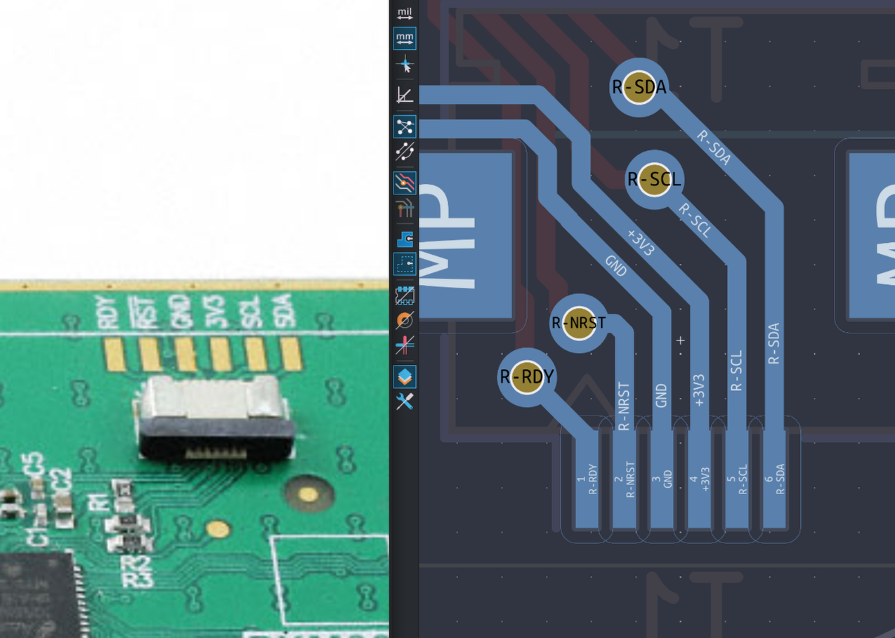 - Because I basically redid the shape of the daughterboard I updated the acording footprint and their location on the pcb so they were still good with the hole locations for the fpc cable pass through, below is it being unaligned and fixed!